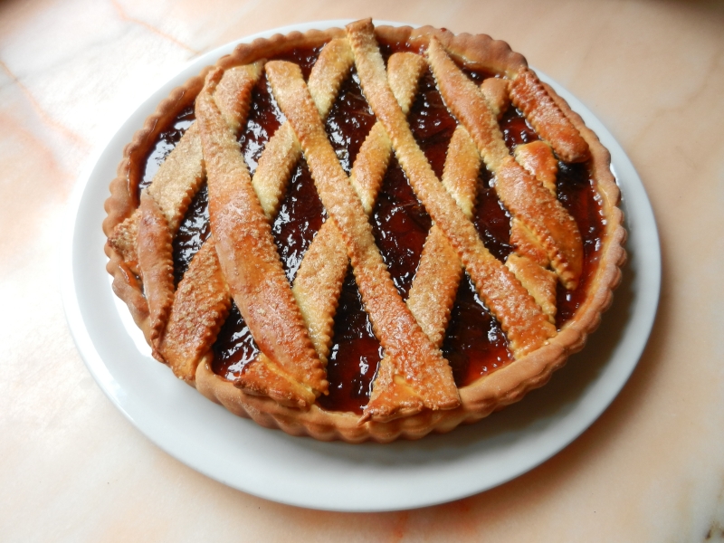 Als de oven warm is, doen dan de vulling in de vorm en leg de repen er in een ruitvormig patroon overheen. Bak de vlaai in 30 minuten mooi bruin.