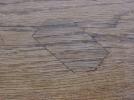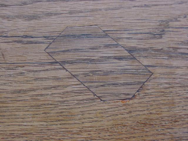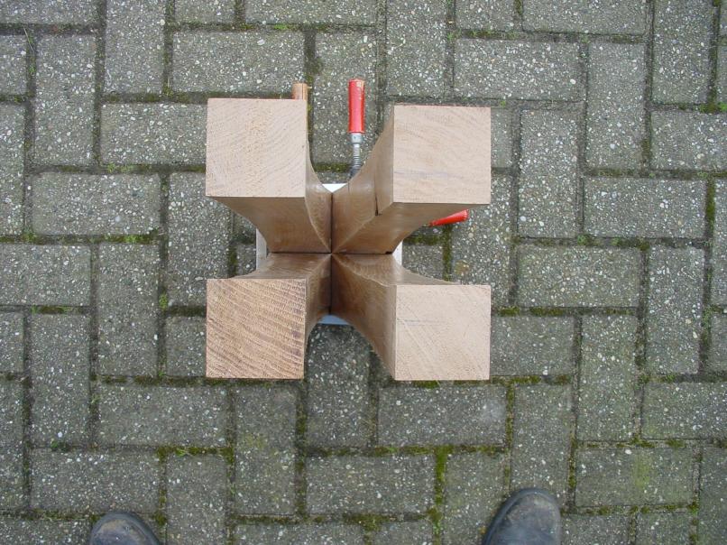 Zoals je rechts kunt zien maakte ik tijdens het zagen een stomme fout: bij het afzagen van de schuine kanten van de eerste poot nam ik de buitenkant in plaats van de binnenkant...; in overleg met Len ben ik geen nieuwe poot gaan maken, maar heb de zaagsnede gevuld met een 3 mm dikke eiken latje: je ziet er gelukkig bijna niets meer van. |
