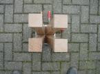 | juni 2004 - ik heb een nieuwe sokkel gemaakt voor het beeld Leven van Mirjam de Nijs. Ik heb de sokkel op geen enkele manier beschermd tegen weer en wind om een zo'n ruw mogelijk effect te krijgen, maar ik ben wel benieuwd hoe lang het hout het uit gaat houden. Het is 4 cm dik eikenhout dus het kan vast wel wat hebben. | ||