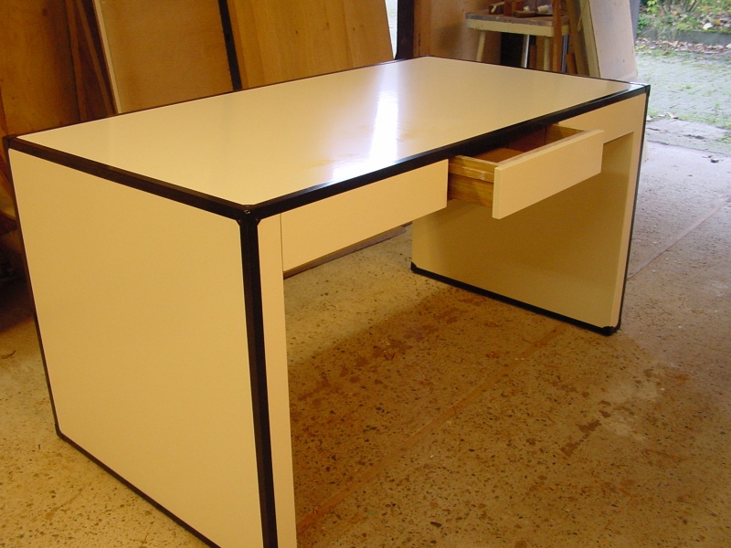 | 1999 - Dit buro heb ik speciaal voor onze nieuwe studeerkamer in Asperen gemaakt. Het is drie meter lang en middenin 80 cm diep. Het materiaal is watervast verlijmd multiplex, waarbij ik twee platen van 18 mm op elkaar heb geplakt. Alle zichtbare randen van het multiplex zijn onder 45° verzaagd om de lijnstructuur beter te tonen. Het buro hangt aan een balk aan de muur, en staat op het centrale ladeblok. Hierdoor kon de ruimte onder het blad zo open mogelijk blijven. | ||