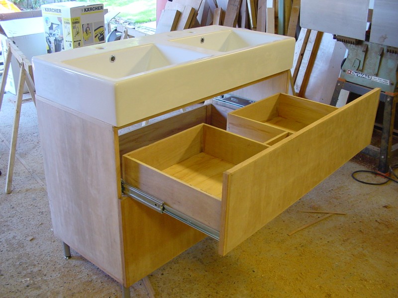 | oktober 2007 - Ik heb voor mijn zus Claar Rekers een badkamermeubeltje gemaakt van multiplex. De onderste la is diep om handdoeken in te stapelen, de bovenste la is juist ondiep voor de flesjes enzo. Ik heb de bovenste la zodanig gemaakt er in het midden ruimte is voor een siphon. Door de uitstekende kwaliteit laderails kunnen de lades maximaal uitgetrokken worden. De kast wordt nog geschilderd, maar om te voorkomen dat de multiplex randen lelijk blijven heb ik de platen rondom voorzien van een teakhouten randje. Er moeten nog handgrepen op de lades komen. | ||