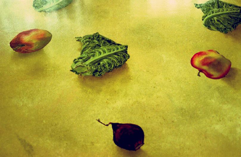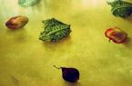 | 1999 - Deze ronde eetkamertafel heb ik speciaal gemaakt voor ons nieuwe huis in Asperen. De tafel is 160 cm in doorsnede, en er kunnen makkelijk 8 mensen tegelijk aan eten. De tafel is van hout en hij is prachtig beschilderd door Ron van der Leeuw. Hij heeft de tafel eerst gemarmerd, en heeft er toen de kolen, uien en appels op geschilderd. De compositie is behoorlijk symetrisch, en vrij rustig. Een rijk bezit! | ||