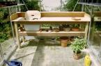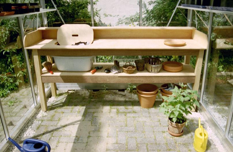 | 2000 - Plantentafel - Deze tafel was een vluggertje... De tafel staat in de kas, en is bedoeld om makkelijk planten op te kunnen verpotten. De tafel lijkt in vorm en maat een beetje op de marmeren sidetable, maar is geheel van hout. Het gat in de tafel dient om bij een bak met aarde te kunnen die op de onderste plank kan staan. | ||